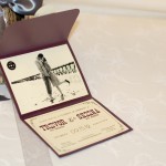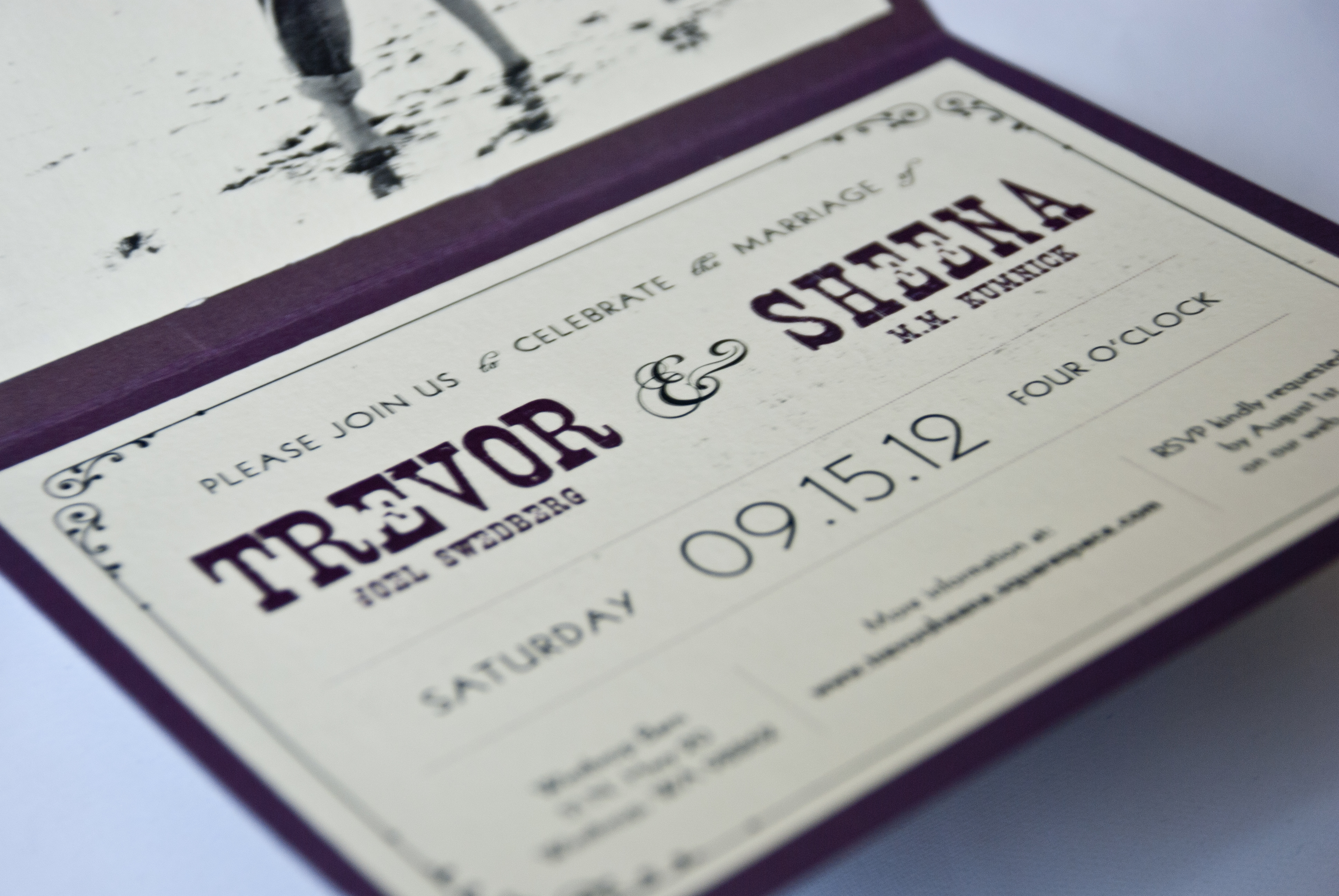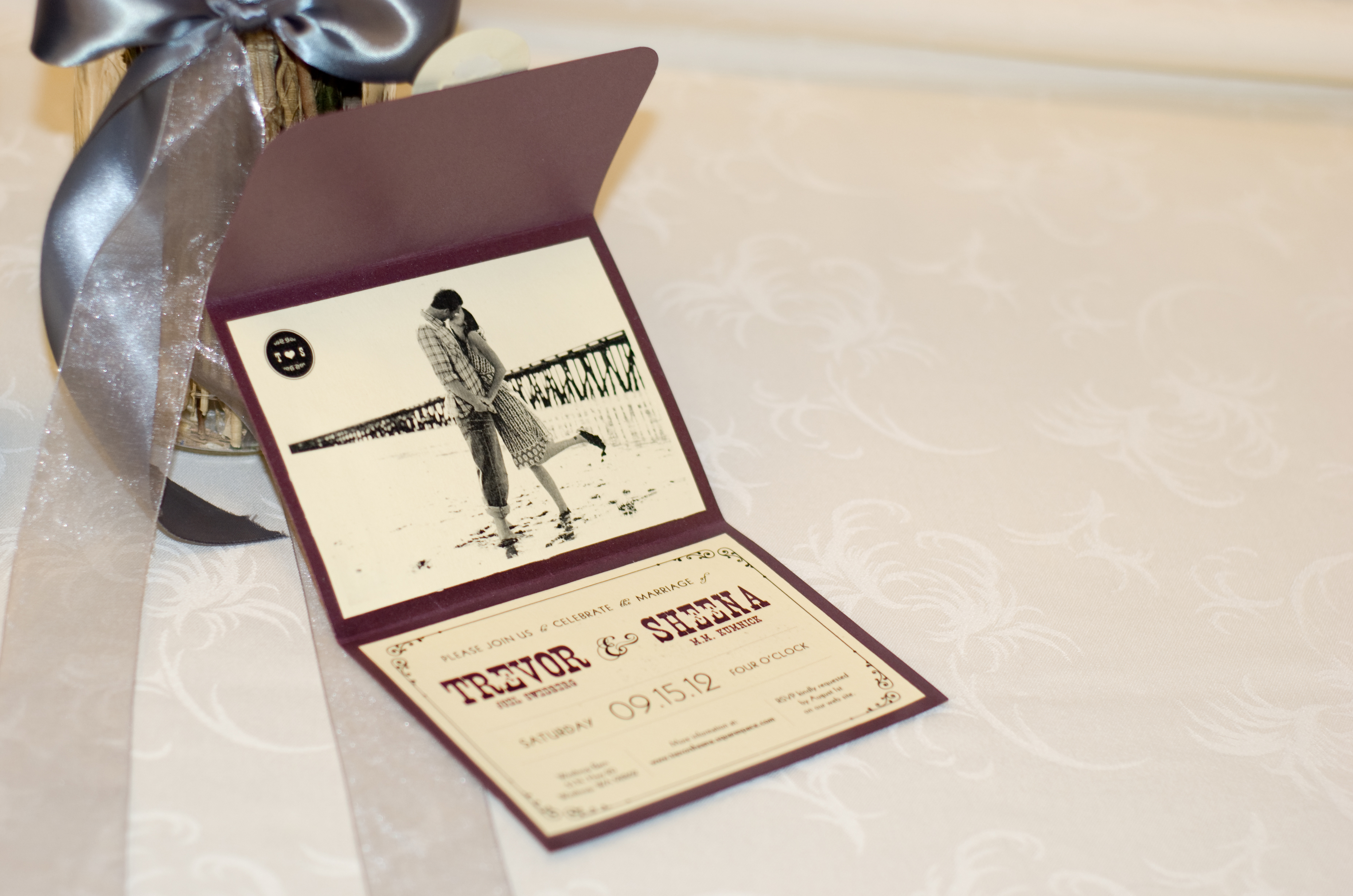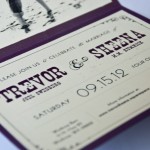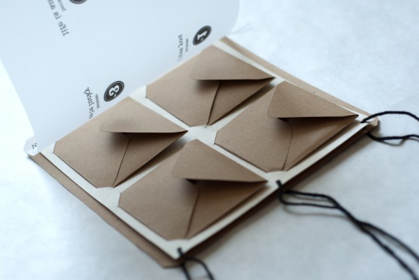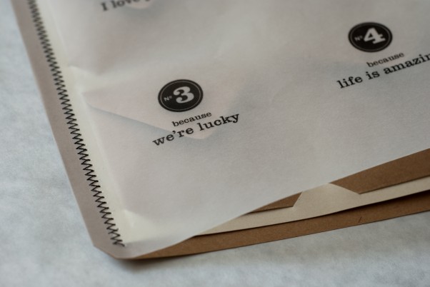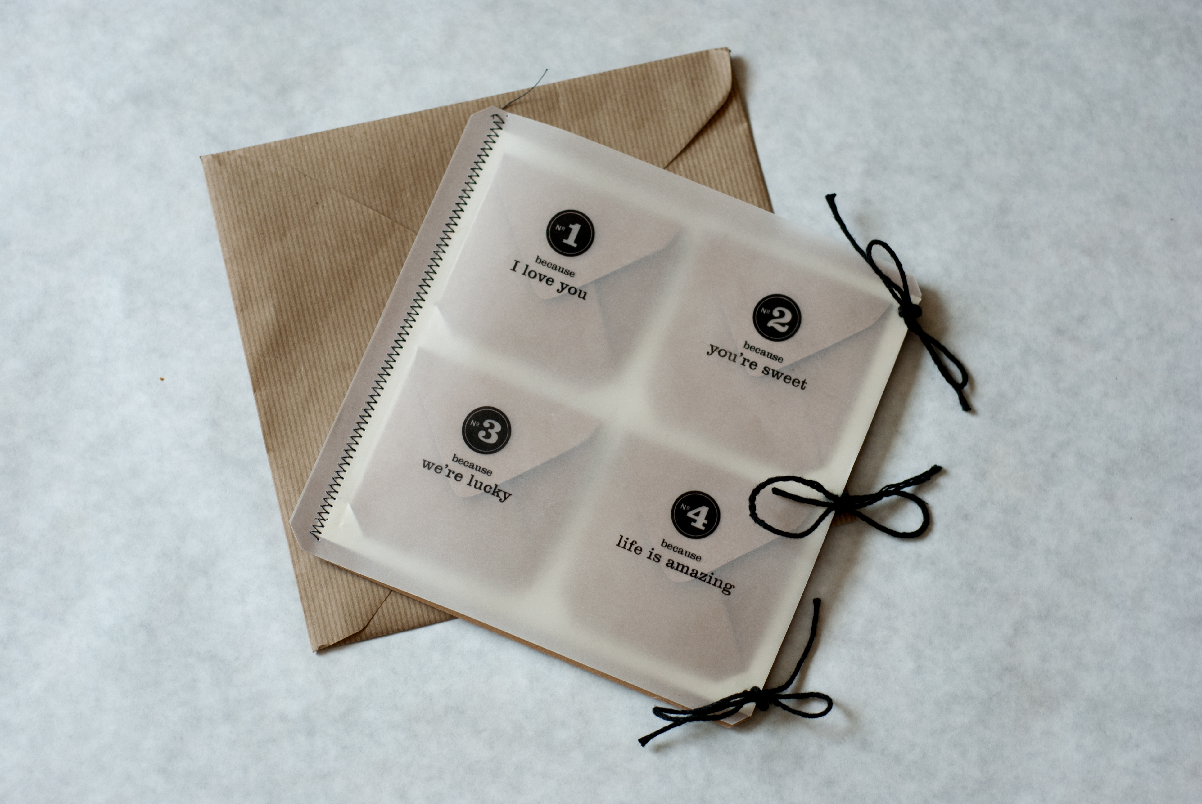 For Jake’s 34th birthday, I designed and hand crafted this multi-layered card containing 4 mini envelopes hidden beneath a velum overlay. Above each envelope there is a number and a clue to something that is inside. The layers of the card are sewn together on the left and fastened with three ties on the right. The card and contents then fit into a larger matching envelope, and his gift was wrapped in a similar style.