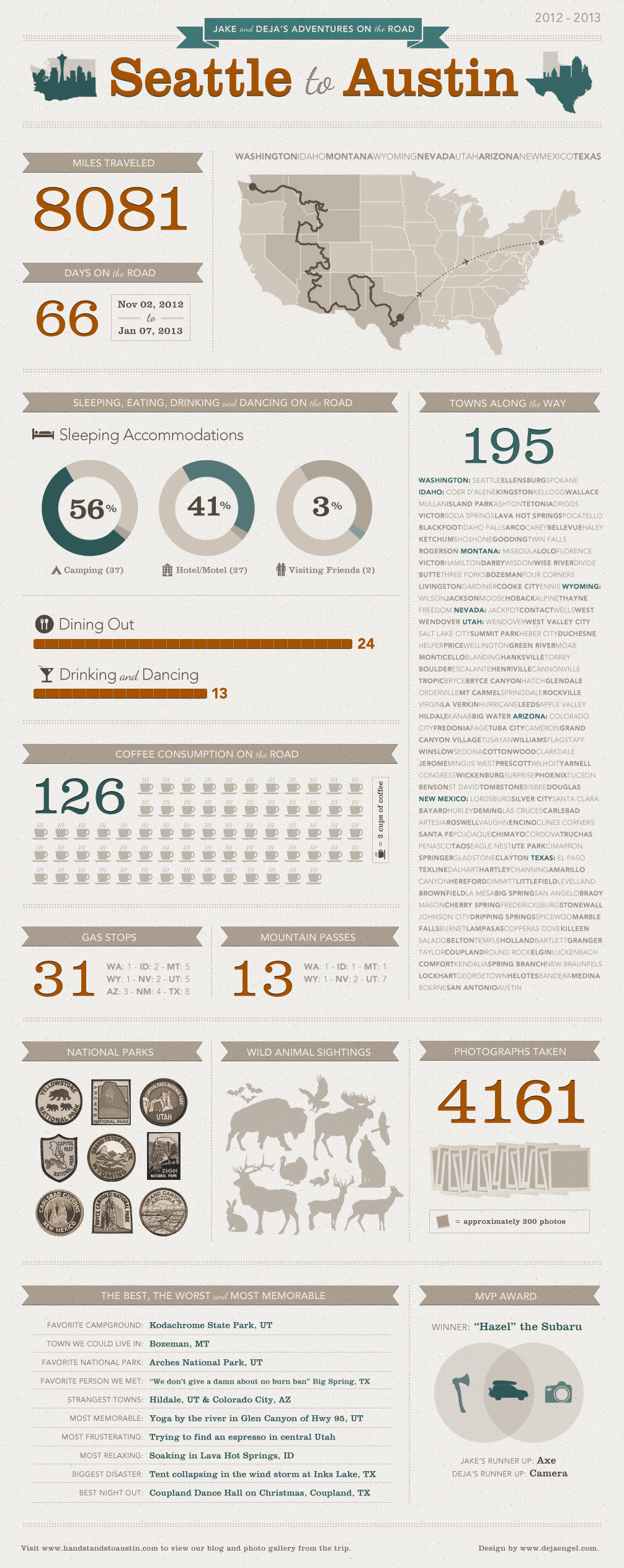 Throughout our road trip from Seattle to Austin, I kept fastidious notes and numerical tallies of every place we stopped, ate, slept, drank, got gas, and so much more. Yes, I know I’m a little crazy, but I thought it would be fun to play with the data later. Here is a visualized roundup of some of that data. I left out many of the fine details such as the names of each restaurant, bar, campground, etc. and their exact locations on the map in order to keep it relatively high level.