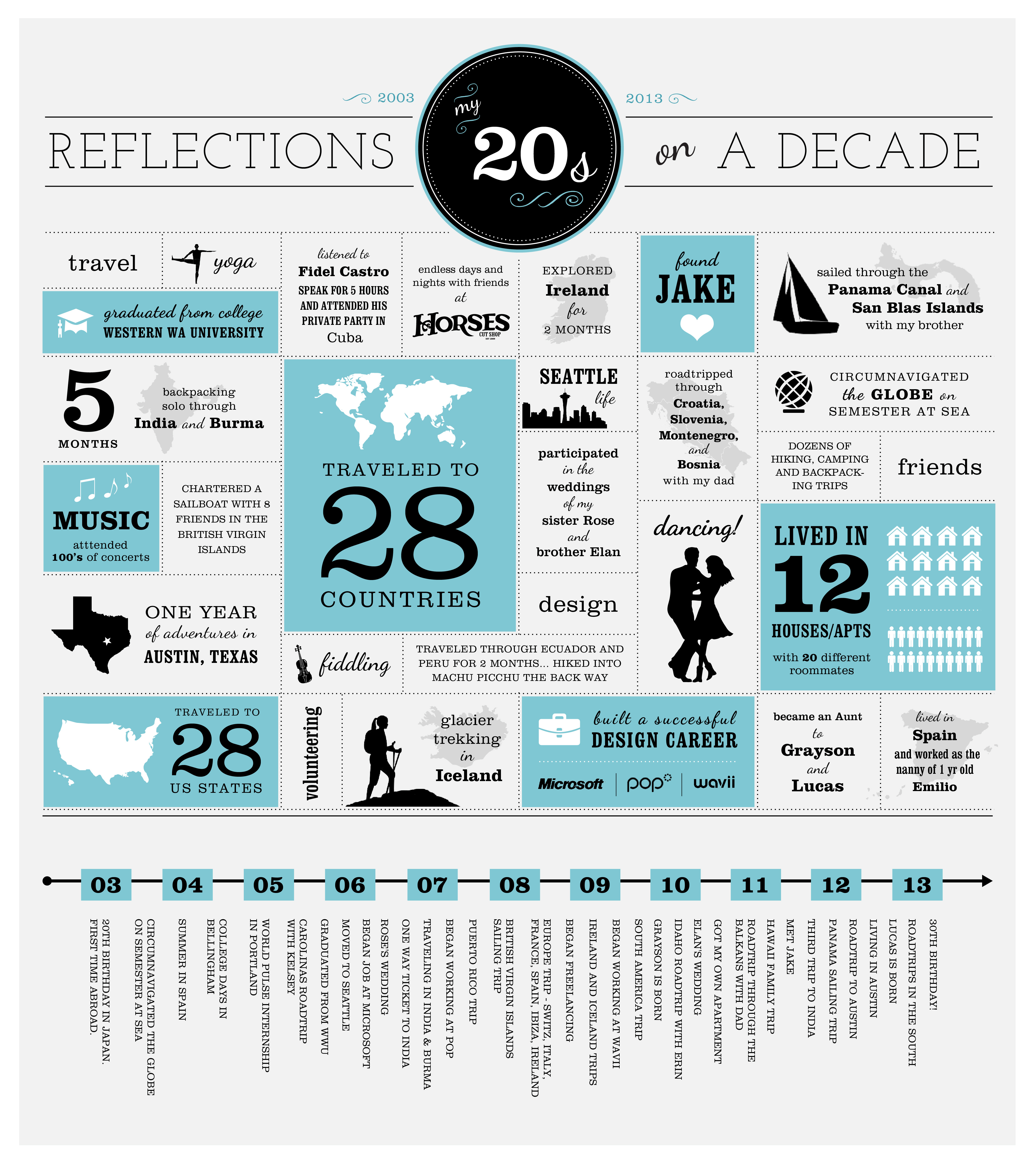 As I turned 30 today, I have been reflecting on the summation of my 20s and I decided to create a visualization of it. A decade ago, I celebrated my 20th birthday in Japan… and it was my first time abroad. As I reflect back, it is clear that the most recurring theme the past 10 years has been travel and adventure. I’m excited to discover what the next decade will bring!